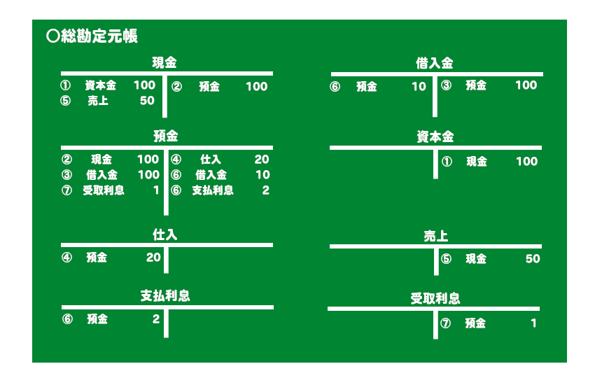 まず現金勘定の左に日付:①、相手勘定:資本金、金額:100円を転記します。