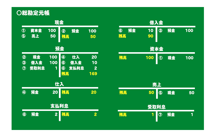 総勘定元帳の各勘定科目ごとの左、右を合計し、その残高が貸借対照表、損益計算書に記入されることになります。