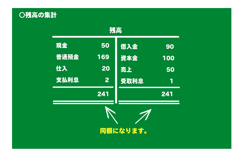 左右に転記してますから集計した金額は同額になります。同額になってなければいけません。