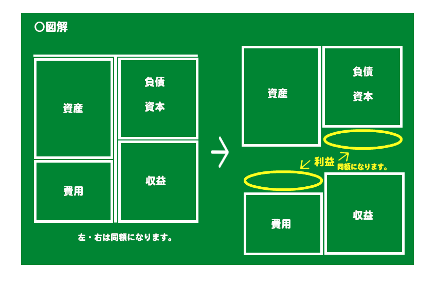 逆の場合→貸借対照表では右側がでっぱり、損益計算書では左側がでっぱっている場合→損失となります。